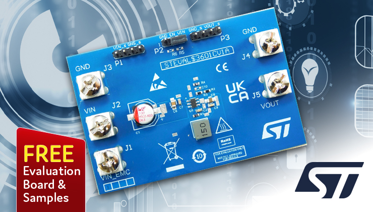 STMicroelectronics DCP3601 wide input buck converter, samples and evaluation kit available from Anglia.