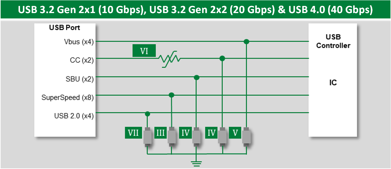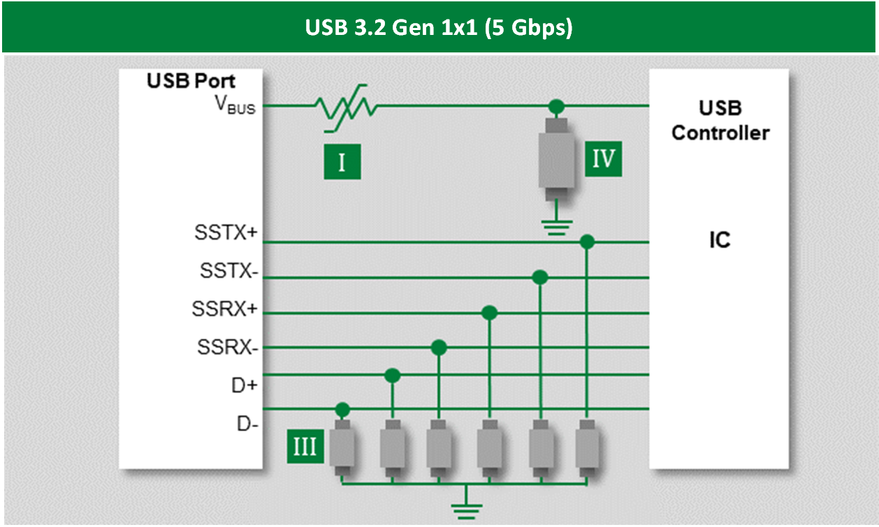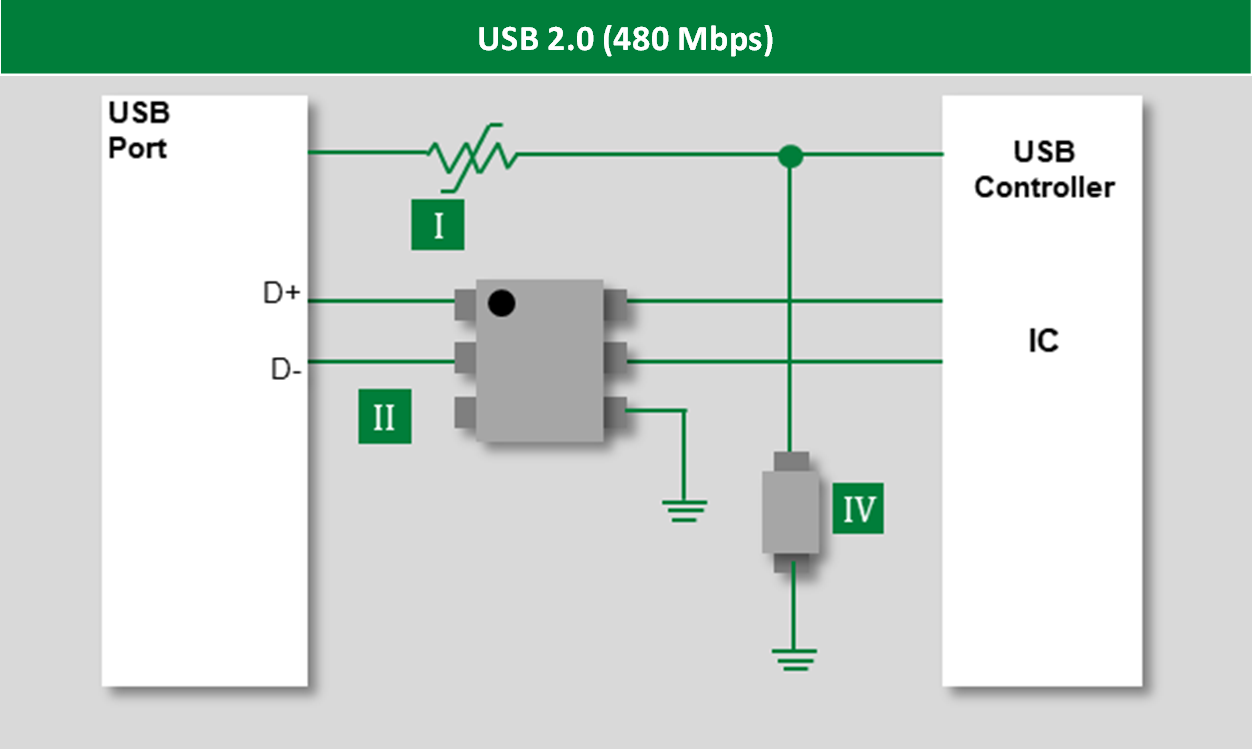 Littelfuse have a range of devices which are suitable for protecting USB ports from these common electrical hazard events, the following block diagrams demonstrate how these devices can be configured to ensure robust protection for your USB ports along with an overview of each device used and its function.