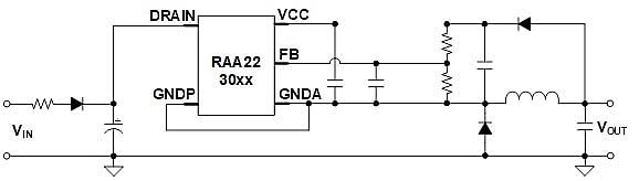 Renesas have addressed these challenges with the RAA223011, RAA223012 and RAA223021 700V buck regulators, the schematic for the non-isolated buck configuration is shown in below schematic and the devices also support isolated flyback topologies.