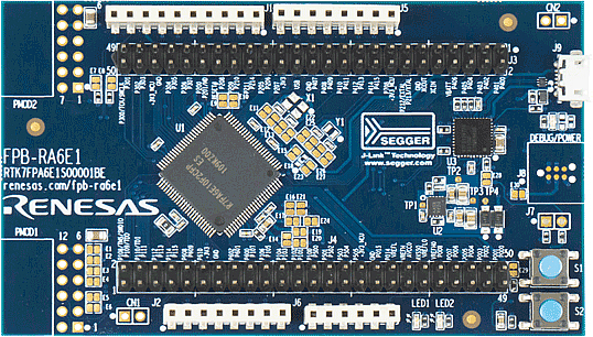 Support for developers is provided with the RA6E1 Fast Prototyping Board which comes equipped with a R7FA6E10F2CFP microcontroller and is an evaluation board specialized for prototype development in a variety of applications. The board has a built-in SEGGER J-Link™ emulator circuit so developers can write/debug programs without additional tools. In addition, with the integrated Arduino Uno and Pmod™ interfaces included as standard and through-hole access to all pins of the microcontroller the board is not only flexible but has high expandability. Sample software is available to demonstrate the functionality of the RA6E1 MCU and for connecting between the RA6E1 Fast Prototyping Board and various wireless modules or various sensor modules.