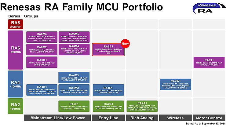 Renesas has expanded its 32-bit RA Family of microcontrollers (MCUs) with a new Group based on the latest Arm® Cortex®-M33 core. The new 100-MHz RA4E1 Group has best-in-class power consumption balanced with high performance and optimized feature integration. It enables fast design cycles and easy upgrades to other RA Family devices.