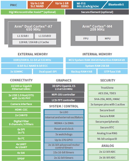 Available in 4 variants the Digi ConnectCore MP1 module family offers a choice of microprocessors, STM32MP133 or STM32MP157, memory sizes 256MB (MP133) or 512MB (MP157) and can be specified as a secure wireless module featuring Wi-Fi 5 and Bluetooth 5.2 or with secure Gigabit Ethernet connectivity. Both the MP133 and MP157 based modules provide a huge array of peripherals and interfaces which include I2C, UART, USART, SPI, CAN FD, USB 2.0 OTG, Timers, Secure RTC, Watchdogs and many other, check the datasheet link on this page for the full list.