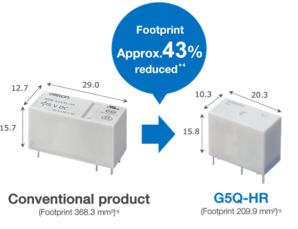 The G5Q-HR range has a compact slim design measuring just 20.3 x 10.3 x 15.8mm, compared with the popular G5RL OMRON relay this represents an approx. 43% reduction in PCB mounting area, yet the relay is still capable of handling currents up to 10A at 277 VAC.