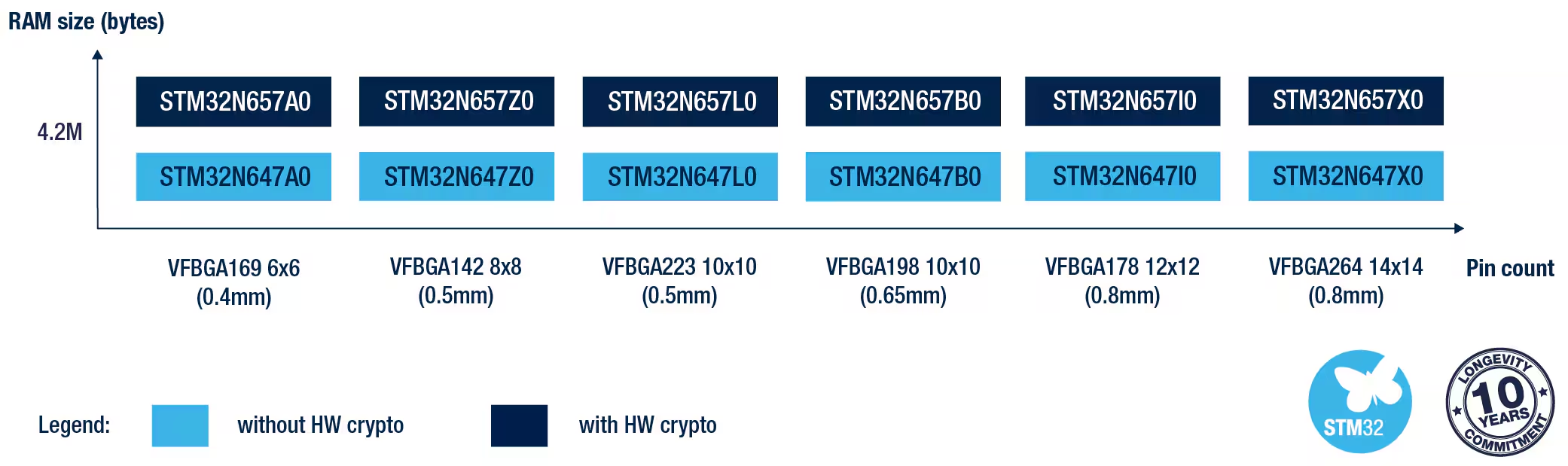 Available in six different package options ranging from 142 to 264 pins and from 0.4 mm to 0.8 mm pitch, the STM32N6x7 family has an industrial operating temperature range of -40°C to +125°C, making it suitable for harsh environments.