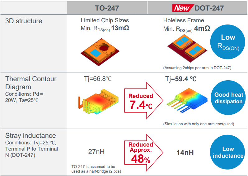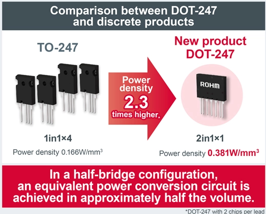 The DOT-247 package features a combined structure consisting of two TO-247 packages, this design has enabled ROHM to use larger chips which were structurally difficult to accommodate in the TO-247 package and achieves low on-resistance through a unique internal structure.