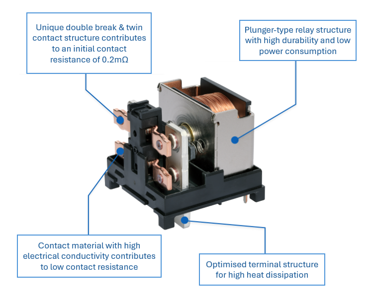 Omron have managed to overcome the temperature rise challenges faced by high-capacity relays; by employing years of technical know-how and world class manufacturing processes, they have developed the G9KA-1A-E power relay which delivers up to 1KVAC 300A with low heat generation.