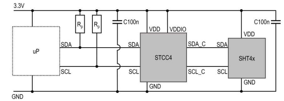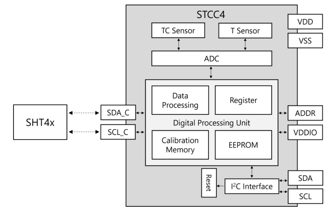 But the STCC4 isn’t just small—it’s smart. The sensor comes 100% factory-calibrated and features automatic on-board compensation for humidity and temperature, enabled through an external SHT4x sensor. This ensures consistent accuracy across varying environmental conditions. Additionally, the built-in Automatic Self-Calibration (ASC) algorithm maintains long-term stability by assuming weekly exposure to fresh air (approximately 400 ppm CO₂), a clever mechanism that reduces maintenance and recalibration needs. Continuous input from an external SHT4x temperature and humidity sensor connected via a dedicated I2C controller interface provides accurate compensation of the CO2 concentration output.