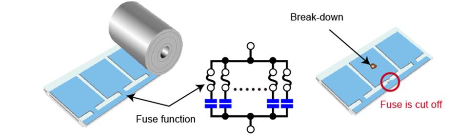 In the event of a localised dielectric breakdown, this mechanism isolates the affected section of the film, preventing fault propagation and eliminating the risk of catastrophic failure. While activation of the fuse function results in a minor reduction in overall capacitance, the component continues to operate safely without compromising system integrity.